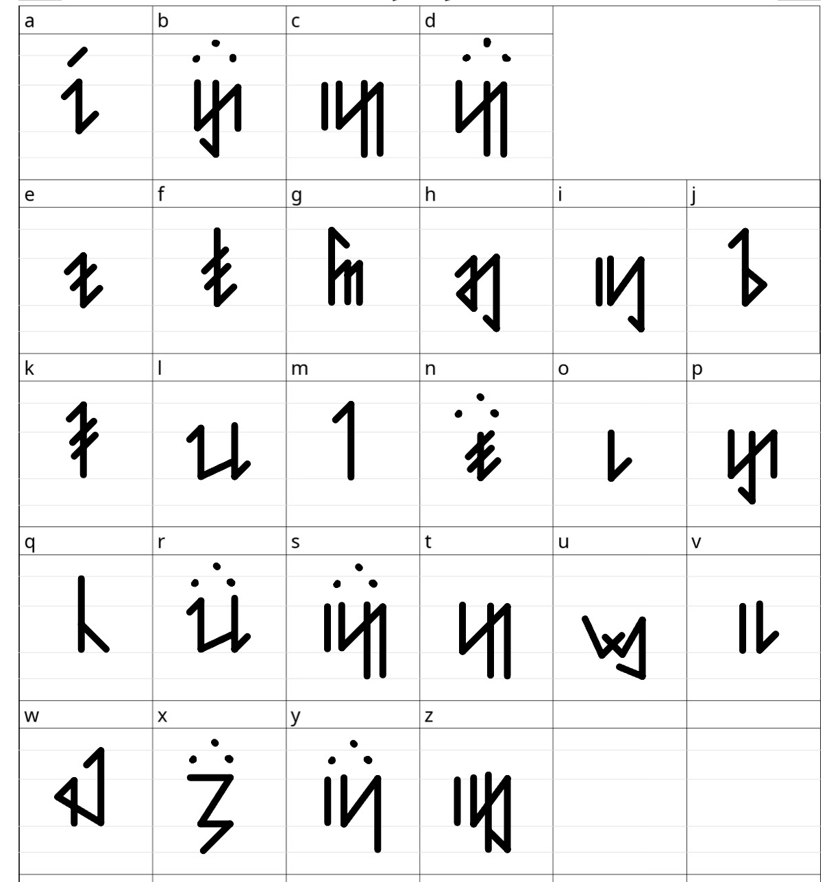 Pour mon univers, j’avais notamment inventé un système d’écriture qui ressemblait à ça :